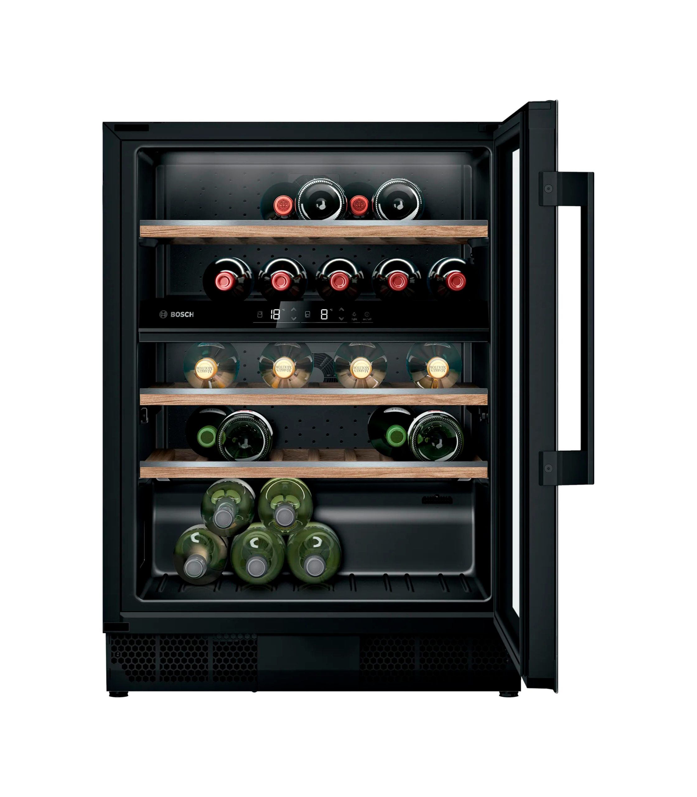 Bosch KUW21AHG0 работает тихо и незаметно, поэтому идеально подходит для кухни или гостиной. Элегантный дизайн, качественные материалы и фирменная надёжность Bosch делают эту модель не просто бытовой техникой, а стильным элементом интерьера и разумной инвестицией в сохранность вашей винной коллекции.